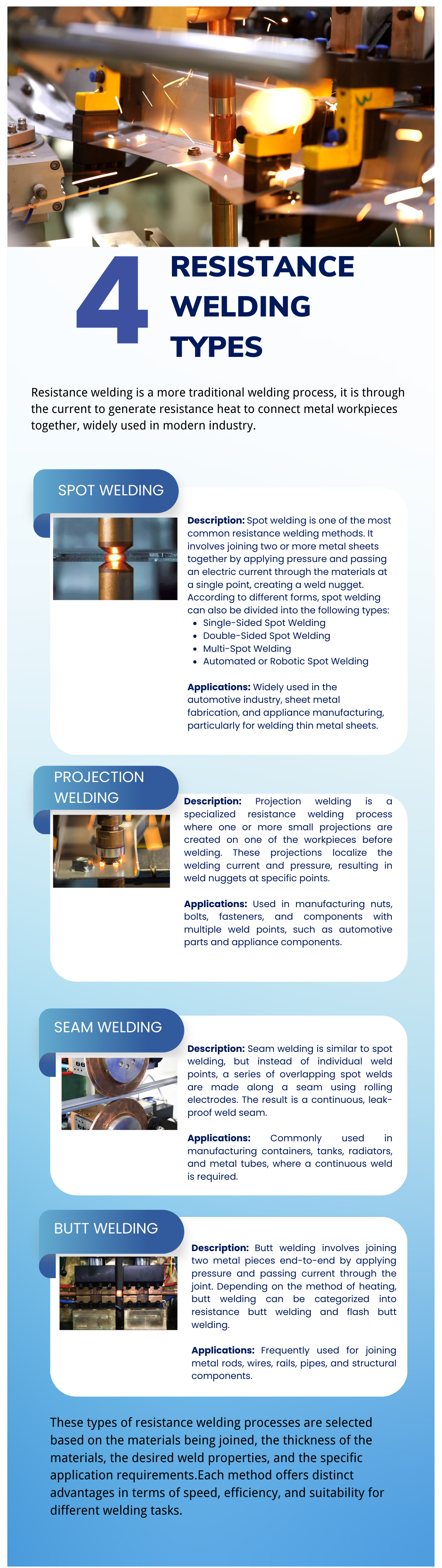Ovanstående är en kort introduktion till de fyra typerna av motståndssvetsning, motståndssvetsning i förhållande till andra svetsprocesser, är relativt sällsynt för vanliga människor, men det är verkligen en mycket viktig svetsprocess. Om du är intresserad av motståndssvetsning kan du följa oss för att lära dig mer om motståndsprocessen.
